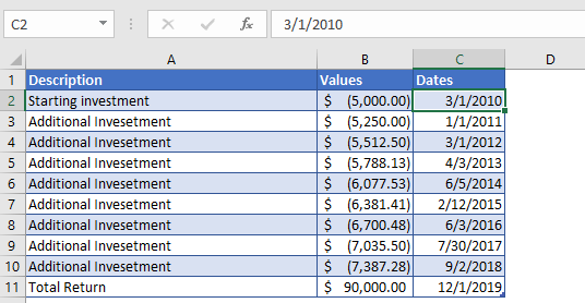 Let us consider the following five values . Xirr is a simple yet powerful excel function that calculates the internal rate of return ("irr") for a series of cash flows not in annual . However, there could be a problem. Problems can occur if dates are entered as text. Scipy optimization functions are fallable to local minima.
